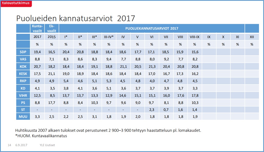 ولكن يبدو ان حادثة الطعن في توركو قد أوقفت تدهور شعبية الحزب، لترتفع بنسبة 1.5 %.