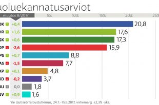 في آخر استطلاع للرأي أجرته هيئة الإذاعة الفنلندية (Yle)، حصل حزب الخضر على ترتيب متقدم على خارطة الاحزاب الفنلندية، حيث حل في المركز الثاني، في سابقة لم يصل اليها الحزب من قبل. وحسب هذا الاستطلاع فقد خسر الحزب الاشتراكي الديمقراطي (SDP) وحزب اتحاد اليسار (vasemmistoliitto) ما مجموعه 4.1 نقطة مئوية من المؤيدين. حل في المركز الأول على خريطة الاحزاب الفنلندية …